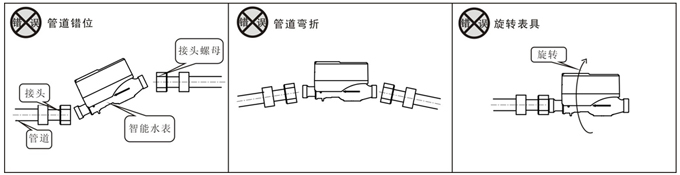 7、智能水表与管道连接时用力不宜过大,以免损坏智能水表。将接头套入接头螺母后安装到管道上,然后扭转接头螺母将智能水表安装到管道上,保持智能水表水平。注意:智能水表以及接头不应受过大的折弯力。禁止出现如下图所示的安装方式: