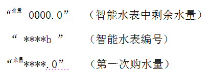 1、持用户卡到售水部门购水,售水部门用管理机将购水量写入IC 卡,将写有购水量的用户卡贴近智能水表卡感应区,依次显示: