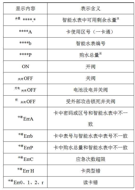 1、将写有开户信息的用户卡贴近智能水表卡感应区,智能水表依次显示:![]() 然后,智能水表开阀供水; |