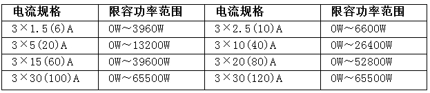如设置有限容功率,电能表自动检测当前用电功率是否超过设置的限容值r,当用电功率连续1分多钟大于设置的限容值时电能表拉闸断电,此时将用户卡靠近电能表感应区可立即恢复供电。如不需要限容功能,需将限容功率设置为0。所设置的限容功率不要超过下表范围: