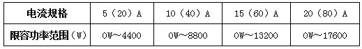 9、电能表可使用用户卡设置限容功率(充值时在软件中设置并可更改,限容功率的设置不要超过下表的范围),当用电功率大于设定的限容功率时电能表拉闸断电,刷用户卡或者检查卡恢复供电,不需要限容功能的将限容功率设置为0。DDSYF-4SYTH和 DDSYF-4WD系列的电能表在20度拉闸报警和限容拉闸报警2分钟后可自动合闸供电;
