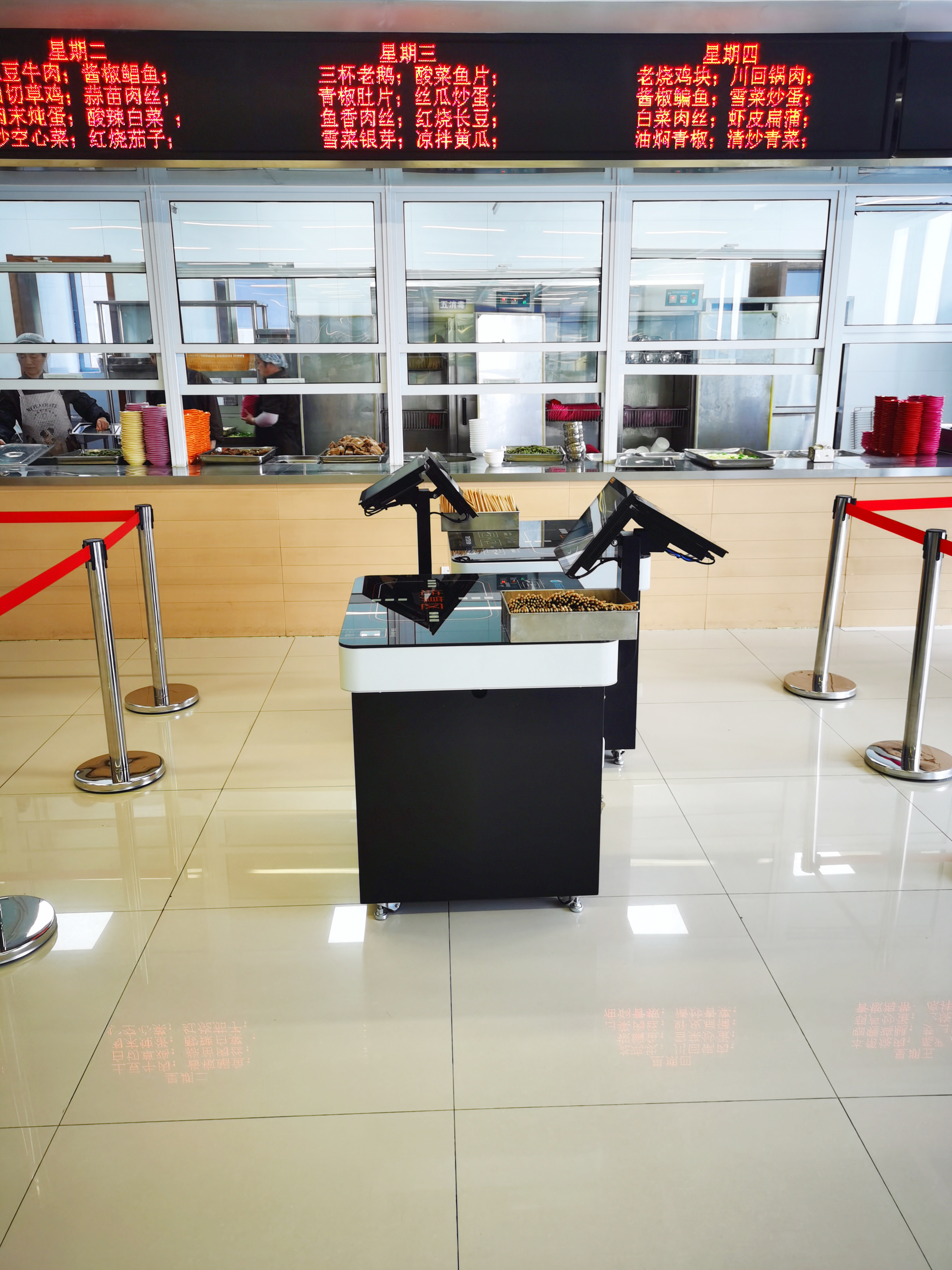 8MM钢化玻璃台面,静电喷塑,耐高温,防潮湿,耐油污,快速结算区+15寸电容触摸主机显示屏+客显工业级。 支持一卡通刷卡、刷脸、餐券、微信支付宝扫码支付。 中餐台长800mm宽700mm高825m